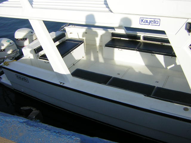 Hull & Deck Section: 1. GRP hull, deck cabin combination. 2. Mid ship floor upper. 3. Port holes P & S x 4. 4. Aft floor lower. 5. Rope storage hatch cover. 6. Outboard motor bracket. 7. Dolphin nose. 8. S/S cleats 10” (4 pcs) 9. S/S guard railing. 10. Gunwale rubber. 11. Fuel tank 800 Ltr. 12. Fresh water tank 150 Ltr. 13. GRP canopy at mid ship 14. GRP canopy at rear.